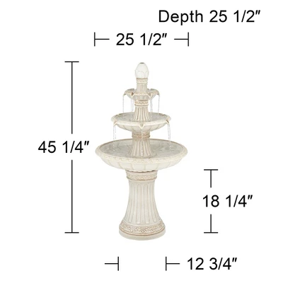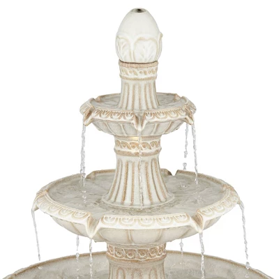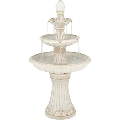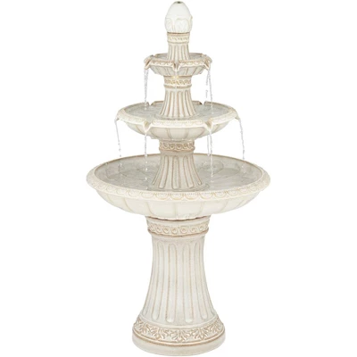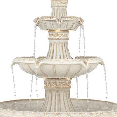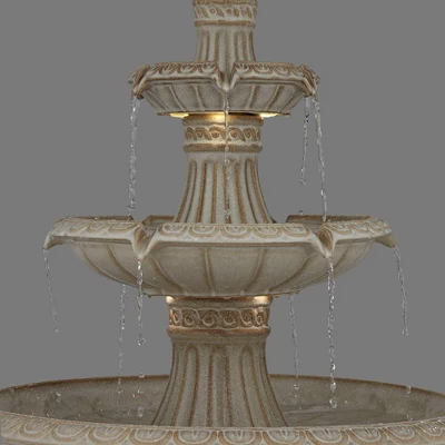 Satisfy a taste for the exotic with this Formentera three-tier outdoor floor fountain, from the John Timberland® brand. Three tiers gentle cascade water in soothing streams and waterfalls, illuminated by energy efficient LED lights. Delicate scrolling designs adorn the off-white finish ceramic construction, looking like a modern take on Roman villas. This fountain is rated for use outdoors.