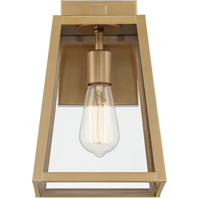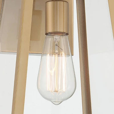Brighten up your home’s exterior with this handsome set of two outdoor wall lights from the Arrington collection by John Timberland. This updated industrial design comes in a tapering soft gold finish frame with a sleek, straight-lined look. Clear glass panels offer a full view of the beautiful vintage Edison style bulb that is included with purchase. Wet location outdoor rated. Vertical installation and wall mount only.