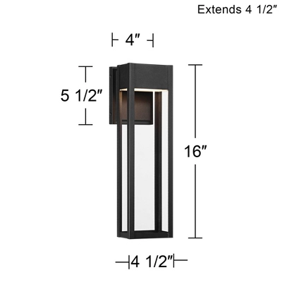 - 16″ high x 4 1/2″ wide. Extends 4 1/2″ from the wall. Backplate is 5 1/2″ high x 4″ wide. Center of mounting point to top of fixture is 3″. Weighs 1.5 lbs.