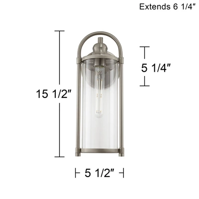 - 15 1/2″ high x 5 1/2″ wide. Extends 6 1/4″ from the wall. Round backplate is 5″ diameter. Center of mounting point to top of fixture is 3″. Weighs 2.5 lbs.