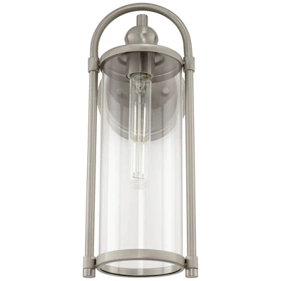 A cylindrical shade enhanced by brushed nickel finish framing is the main focus of this Indoor/outdoor wall light. One visible bulb housed within provides ambient lighting. The curves and lines in the framing provide an intriguing geometric element. Easily upgrade your curb appeal by adding these lights to a garage or covered entryway.