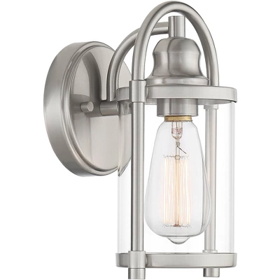 A cylindrical shade enhanced by brushed nickel finish framing is the main focus of this Indoor/outdoor wall light. One visible bulb housed within provides ambient lighting. The curves and lines in the framing provide an intriguing geometric element. Easily upgrade your curb appeal by adding these lights to a garage or covered entryway.