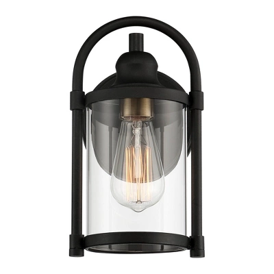 From the John Timberland brand, this wall lantern offers a warm look for your home. It features clear cylinder glass, a black finish metal frame and top lantern arm, and a warm brass finish bulb socket. Easily upgrade your curb appeal by adding these lights to a garage, patio, or porch entryway.