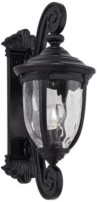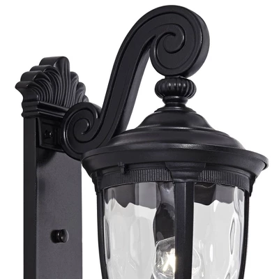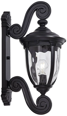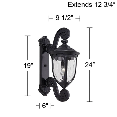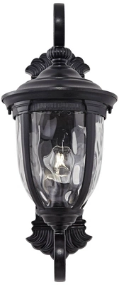The Bellagio collection by John Timberland is inspired by classic European designs and guarantees a lovely traditional look. This outdoor wall light comes in a texturized black finish over a sturdy die-cast metal construction and clear hammered glass for elegance and refinement. Dual upbridge and downbridge scroll arms complete the elaborate look of this fixture.
