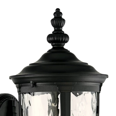 - Texturized black finish over sturdy die-cast metal construction. Clear hammered glass. Decorative upbridge arm.