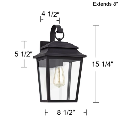 - 15 1/4″ high x 8 1/2″ wide. Extends 8″ from the wall. Backplate is 5 1/2″ high x 4 1/2″ wide x 1″ deep. Mounting point to top of fixture is 6″ high.