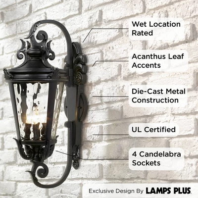 The lavish Mediterranean styling of this outdoor wall recalls the romance and magic of the French port city of Marseille. This beautiful four-light fixture features clear hammered glass paired with rich detailing and a textured black finish in a sturdy die-cast metal construction. Use it to illuminate walkways and patios, or install it as a porch light for instant curb appeal.