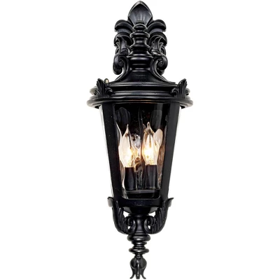 This beautifully styled outdoor light recalls the romance and magic of the Mediterranean port city of Marseilles. The intricate design features ornate scroll accents, acanthus leaf detailing, and a backplate decorated with a classic fleur di lis accents. Clear hammered glass contrasts wonderfully with the rich detailing and the textured black finish.