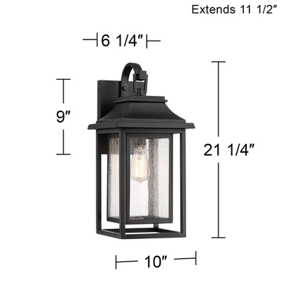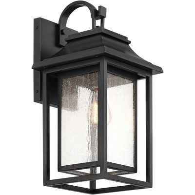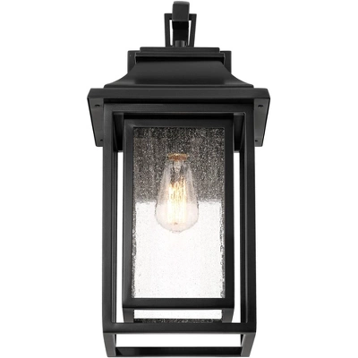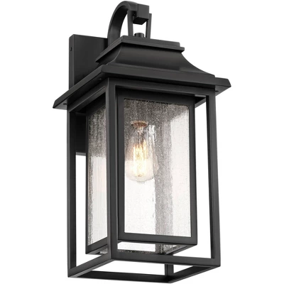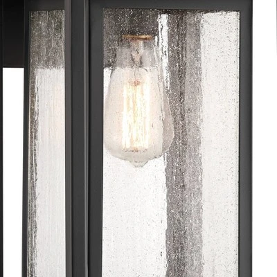 From the Cecile collection by John Timberland®, this outdoor wall light offers a modern update of classic lantern styles. It comes in a black finish open rectangular frame, which surrounds a rectangular seedy glass shade that holds the bulb socket. The result is a geometric double box look, which provides an eye-catching effect wherever you install it.
