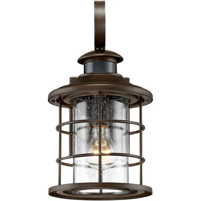 With an oil-rubbed bronze finish, this Hogan motion sensor lantern outdoor wall light by John Timberland® naturally exudes richness and warmth. With seedy glass, this wall light is decorated with distinct and eye-catching detail. As a motion sensor, this light will turn on to inform you of any movement near your home, as well as provide lighting when you need to be outside after dark. Light turns on at 25% brightness and will brighten up to 100% brightness when motion is detected. Will go back to 25% brightness, one minute after motion is no longer detected.