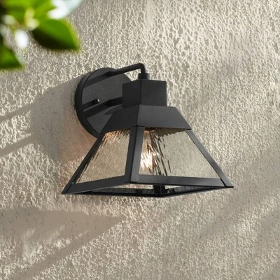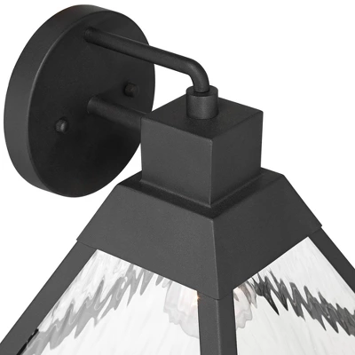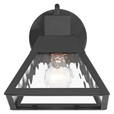Light up your porches and patios with this elegantly minimalist Delia outdoor wall light from the John Timberland® brand. The textured black finish frame is intersected with clear, watery glass panels allowing unfiltered illumination. Pair two of these lights to frame an entry or exit to your home for welcoming charm. The Delia wall light is wet location rated for outdoor use.