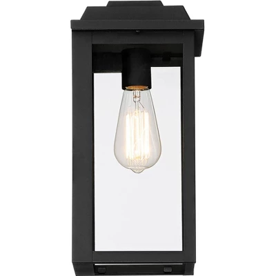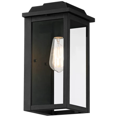 Update your home with this set of two transitional outdoor wall lights from the Eastcrest collection by John Timberland. Featuring clean, straight lines and an unassuming rectangular silhouette, it fits into any style or setting. The frame is constructed from steel and painted over in a textured black finish, with clear glass panels supporting throughout. Perfect for a porch, patio, or garage.
