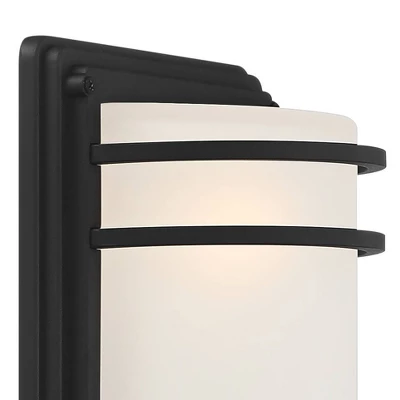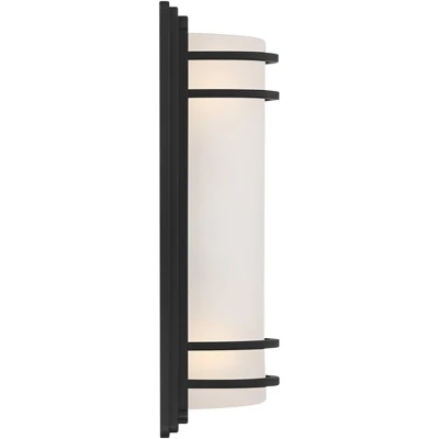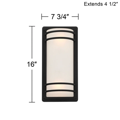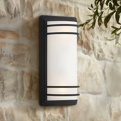 This set of two contemporary two-light outdoor wall lights offers a modern style statement for your home. From the John Timberland collection of home lighting designs, this pocket wall sconce features a handsome industrial look with a black finish steel frame paired with a chic frosted white glass shade. It’s a great addition to a porch or patio wall, and can also be installed indoors to illuminate hallways and more.