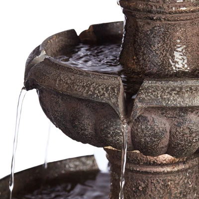 A romantic Euro-style design embellishes the charming beauty of this gray stone finish three-tier outdoor floor water fountain. Bonus lighting increases its mood-altering effects after dark, blending with the soothing sounds of cascading water. Metalized accents attract light and add beauty. Holding five to six gallons of water, its energy-efficient LED light modules deliver an output of 120 volts.