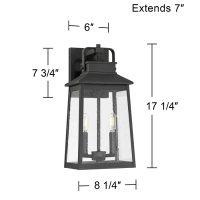 - 17 1/4″ high x 8 1/4″ wide. Extends 7″ from the wall. Backplate is 7 3/4″ high x 6″ wide. Center of mounting point to top of fixture is 3 1/2″. Weighs 9.5 lbs.
