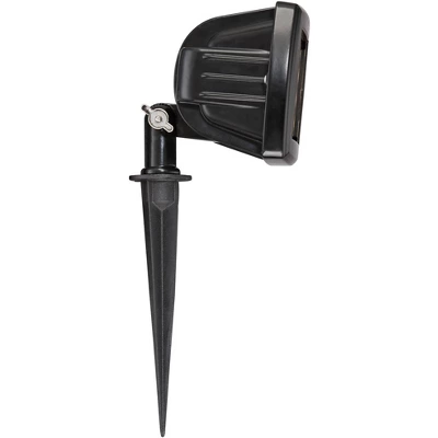 - Black finish. Sturdy die-cast aluminum housing construction. Heat-tempered glass lens. Plastic ground stake.