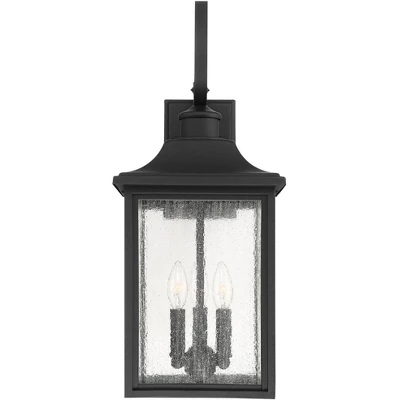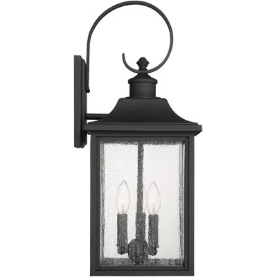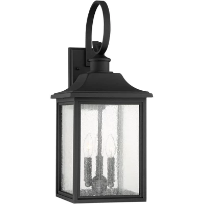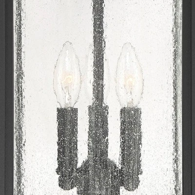 Inspired by traditional lantern-style lighting, this three-light outdoor wall light is a handsome addition to your porch or patio. It features a classic black finish and seedy glass panels that create a beautiful rain-washed effect. It makes a handsome addition to a front porch, patio area, or for garage lighting. This fixture can only be installed vertically as shown.