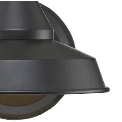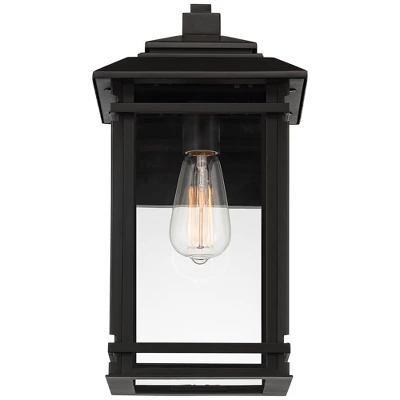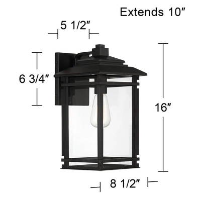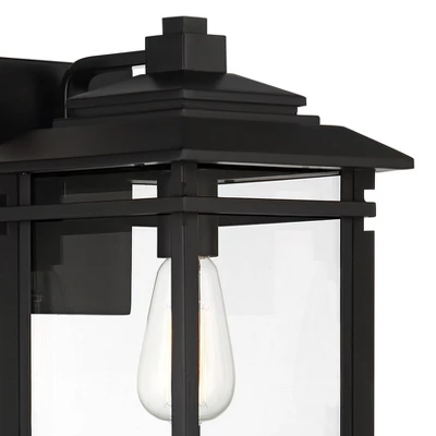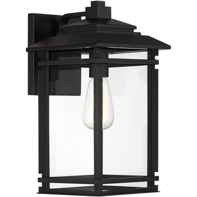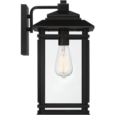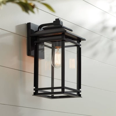 Brighten up an outside space with this lighting fixture from the North House collection by John Timberland. A handsome lighting solution for a porch or patio, this outdoor wall light comes in a steel frame with the elegant silhouette of classic Mission style lighting. A matte black finish is the perfect complement to this design. The clear glass panels gives a full view of the bulb used within, making decorative light bulbs an excellent choice for this fixture.