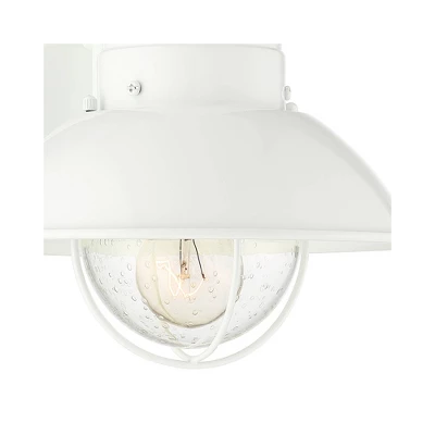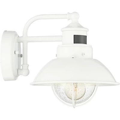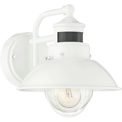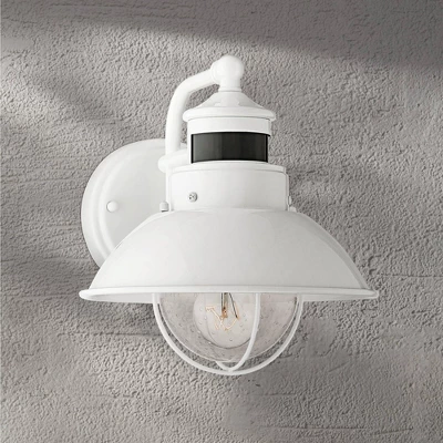 Inspired by classic Mission styles, this outdoor wall light fixture will add a traditional barn light look to your porch or patio. It comes in a crisp white finish over a steel frame, and has a round clear seeded glass shade that protects the bulb. Best of all, this design is outfitted with both a motion sensor and a dusk-to-dawn photocell sensor, giving you an extra sense of security. Dual-bright design means the light turns on at 25% brightness and goes to 100% when motion is detected. Two minutes after motion is no longer detected, the light will revert to low-level brightness.