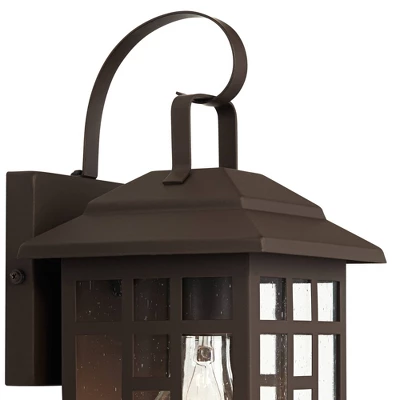 - Bronze finish frame, backplate, and top scroll arm. Metal construction. Clear glass panels. Wet location rated for outdoor use. Vertical installation only as shown.