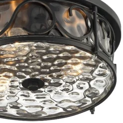 - Dark faux wood and black finishes. Metal construction. Clear glass allows the bulb to be seen. An ideal look for patios and porch lighting.