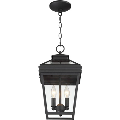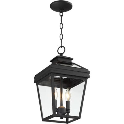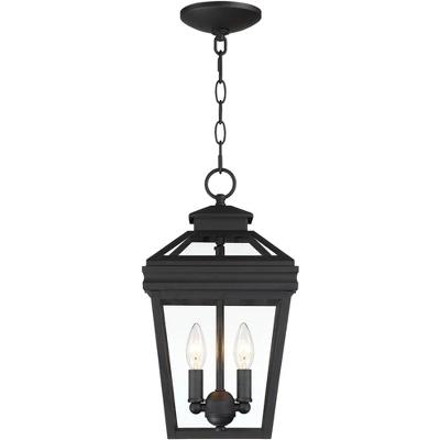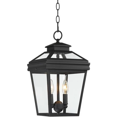Brighten up a dark patio or backyard space with this two-light outdoor hanging light. It comes in a textured black finish over a steel frame, with clear glass panels that give a full view of the bulbs inside. Modeled after traditional lantern styles, this outdoor lighting fixture is sure to add elegance to your home.
