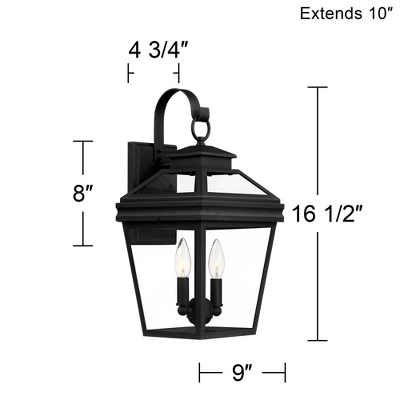 - 16 1/2″ high x 9″ wide. Extends 10″ from the wall. Backplate is 8″ high x 4 3/4″ wide. Distance from mounting point to top of the fixture is 5 1/2″ high. Weighs 6.6 lbs.