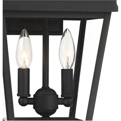 - Clear glass panels allow bulbs to be seen. Textured black finish with top arm scroll. Steel construction.