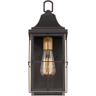 The Sunderland outdoor wall light from John Timberland offers a handsome traditional look for your home. The rectangular steel frame is covered in a classic finish with subtle gold finish accenting for an elegant expression. Clear glass panels give a full look of the light bulb used within, making a decorative bulb (not included) a great choice for this fixture.