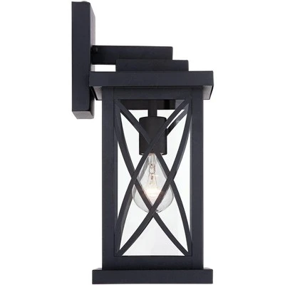 This black finish outdoor wall light offers an Mission inspired look that is both stylish and eye-catching. The design is crafted from steel, and comes with framed clear glass panels. With a dusk-to-dawn photocell, this light offers security by turning on automatically when the sun sets and off when the sun rises.