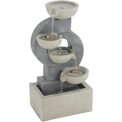 The calm sound of cascading water enhances the natural design of this LED five-tier floor fountain from the John Timberland® brand. A gray finish flatters the natural faux stone appearance, made to look like the fountain’s been carved from solid rock, with four charming bowls and a lower basin that initiate a continuous flow of water. A graceful curving design creates a statuesque appeal. This fountain reinforces a nature-influenced feel and offers energy-efficient LED lighting for mood enhancement.